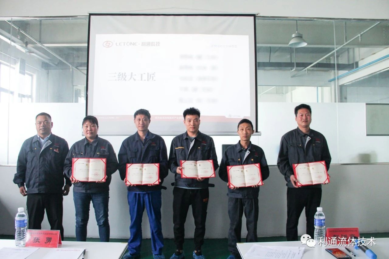 在全体参会人员的见证下,董事长赵洪亮、副总刘铁旦以及大工匠代表共同为利通科技大工匠工作室揭牌。董事长为22名大工匠颁发大工匠聘书并祝贺各位大工匠正式加入大工匠工作室。