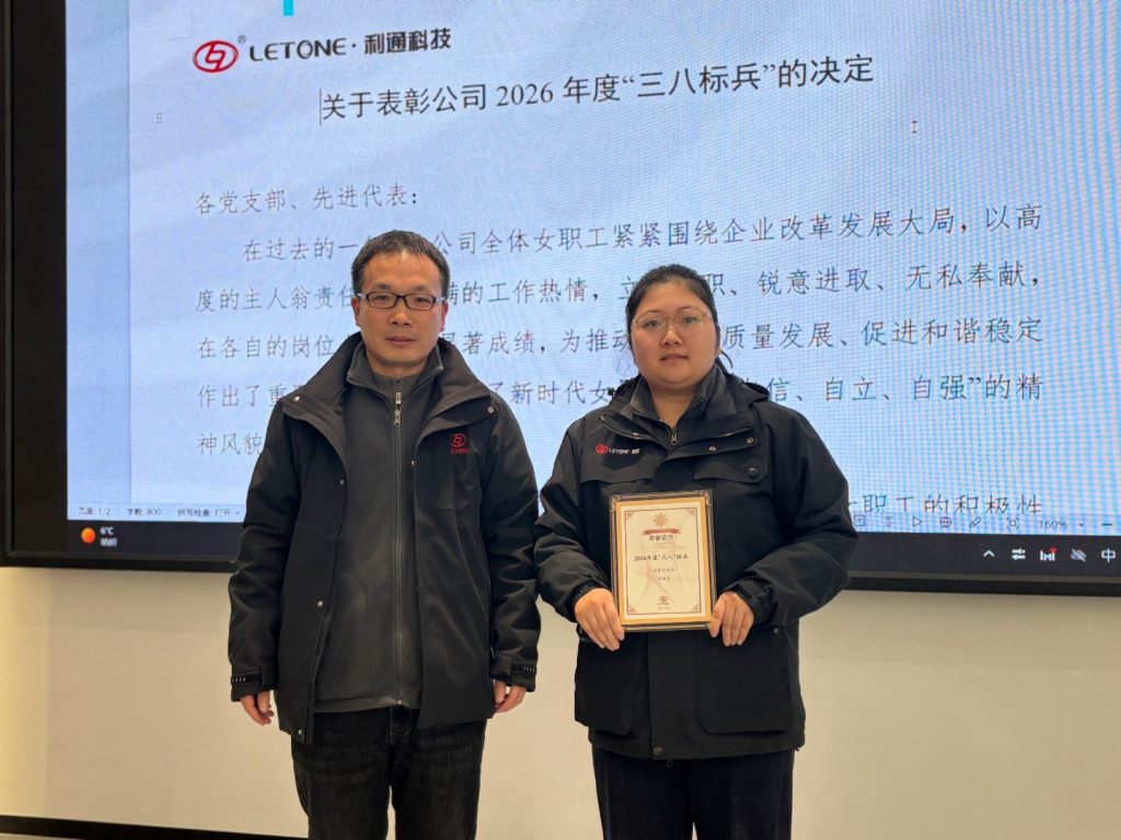 会上,刘铁旦首先代表公司党委向全体女职工致以节日的问候和美好祝福,对大家长期以来立足岗位、拼搏奉献的辛勤付出给予高度评价与充分肯定。他表示,利通科技广大女职工以实干担当诠释初心使命,以坚守奉献彰显巾帼风采,展现了新时代女性的责任与情怀。随后,刘铁旦宣读了《关于表彰公司2026年度“三八标兵”的决定》,公布了以质量管理部陈娇龙为代表的10名“三八标兵”名单,并希望受表彰的先进个人珍惜荣誉、再接再厉,持续发挥先锋模范作用,在本职岗位上再创佳绩、再立新功。宣读完毕后,刘铁旦为“三八标兵”代表现场颁发荣誉证书。